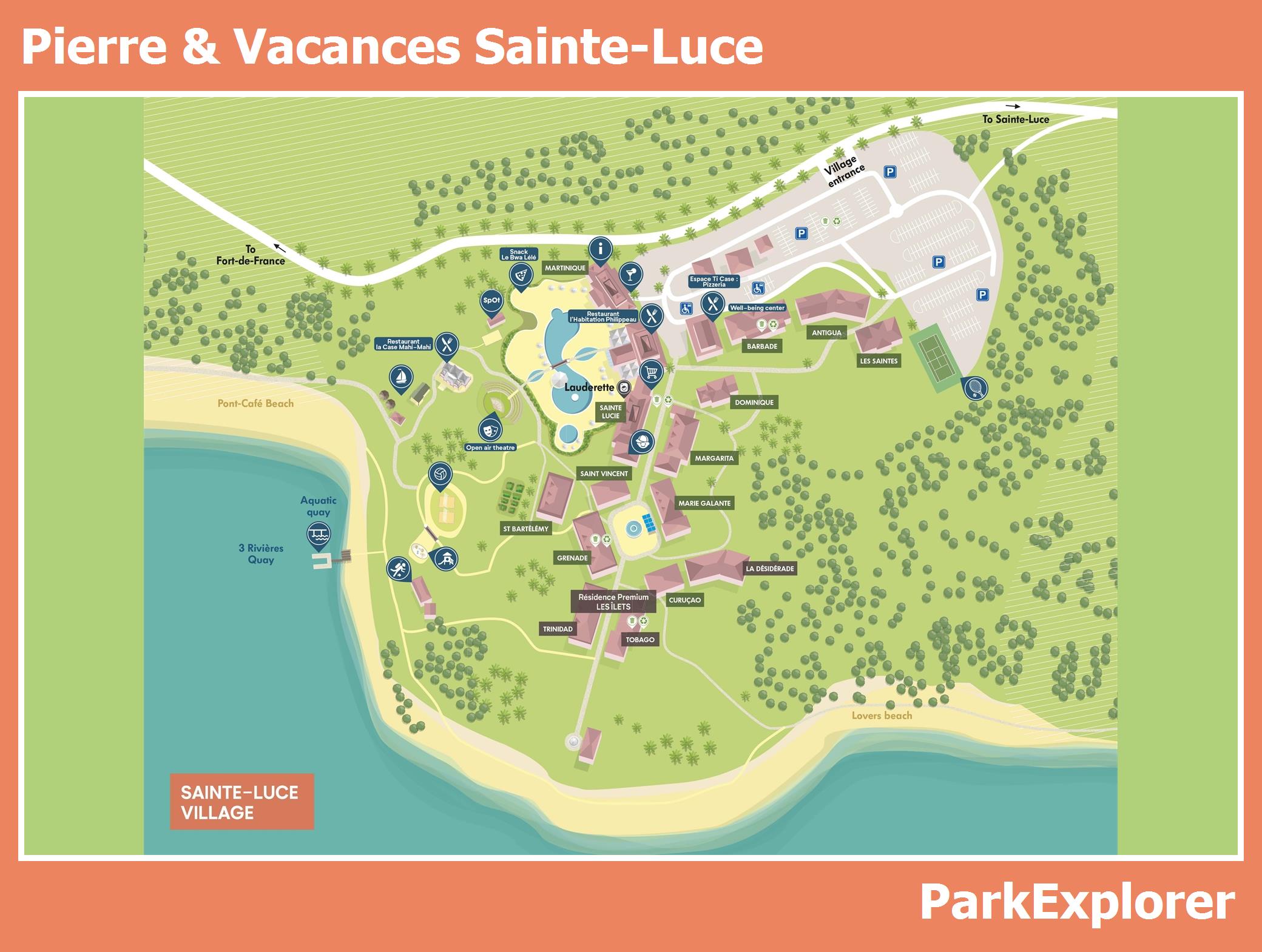 Actuele en overzichtelijke park plattegrond van Pierre & Vacances Sainte-Luce met alle huisjes en faciliteiten, ook te downloaden als PDF.