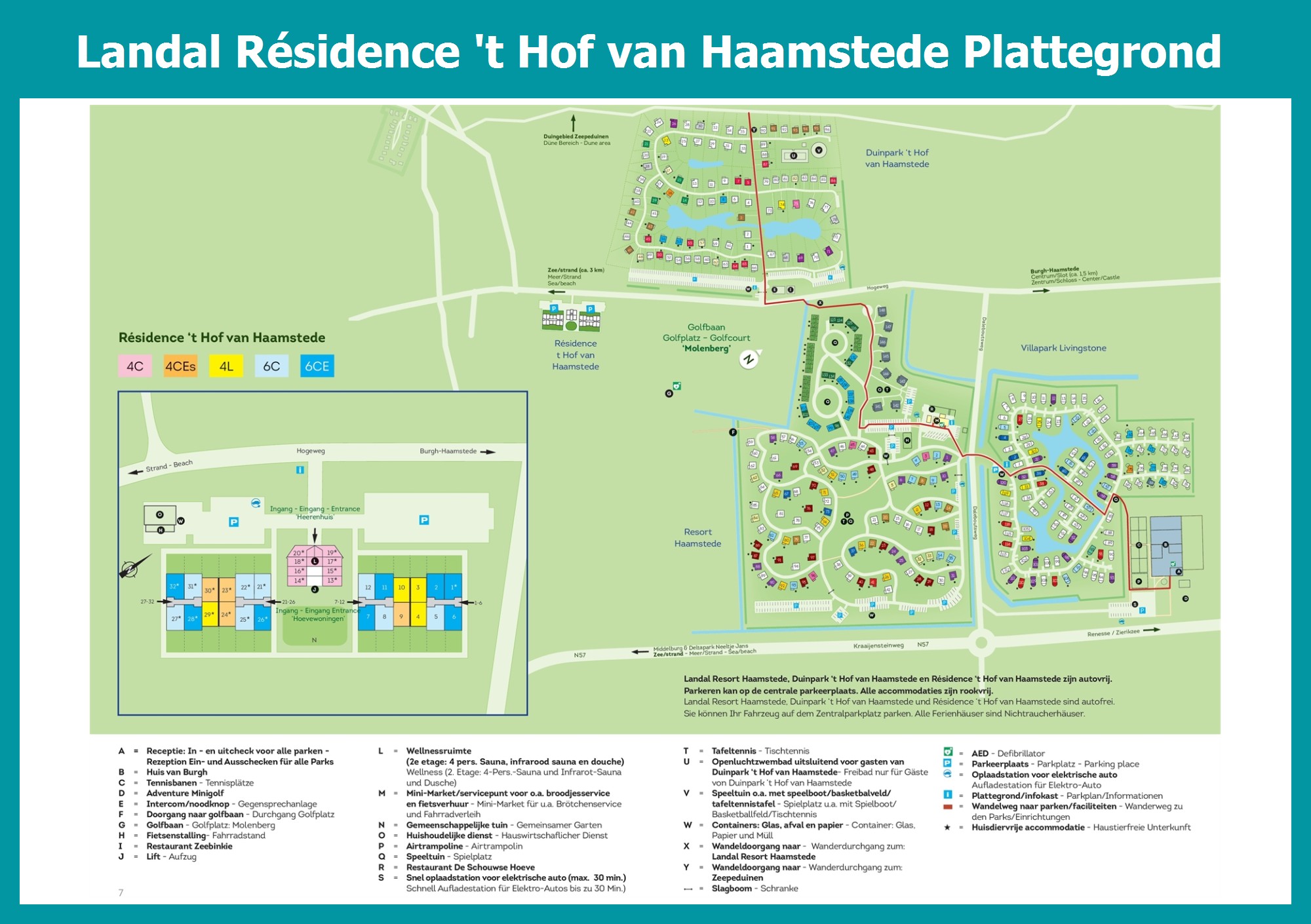 Actuele en overzichtelijke park plattegrond van Landal Résidence 't Hof van Haamstede met alle huisjes en faciliteiten, ook te downloaden als PDF.