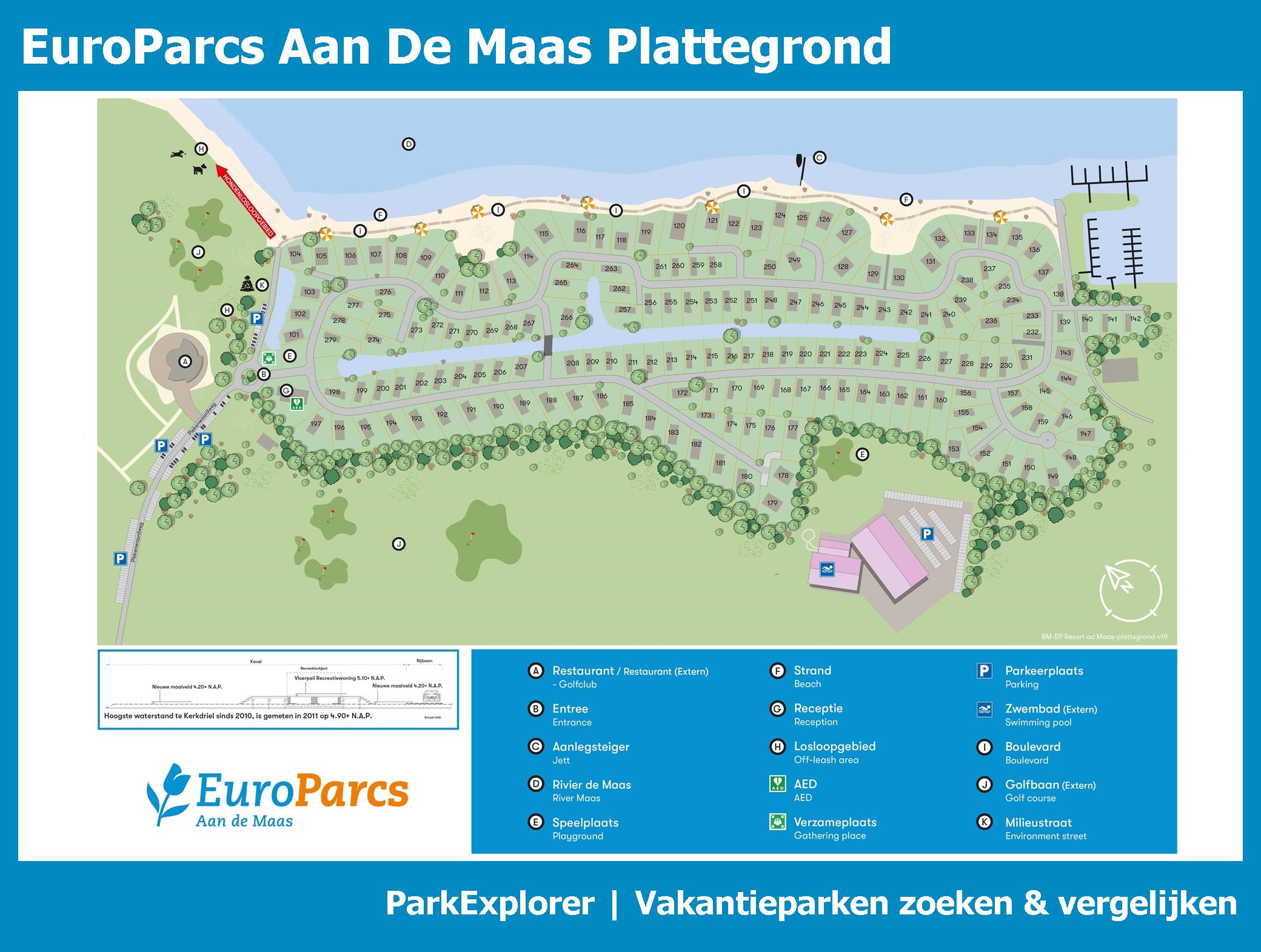 De park plattegrond van Aan De Maas is niet alleen zeer handig tijdens het verblijf, maar vooral ook tijdens het boeken. De plattegrond geeft een goed beeld van de aanwezige faciliteiten en de ligging ervan op het park. TIP: Boek met voorkeursligging en kies een huisje in de buurt van de belangrijkste faciliteiten.
