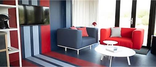 Klaar voor de start? Tijdens je verblijf in deze Grand Prix lodge nemen we je mee in de wereld van races, coureurs en snelle auto’s. Het bijzondere interieur staat volledig in het teken van de opvallende kleuren van Martini Striping, de vroegere hoofdsponsor van racehelden Helmut Marko en Gijs van Lennep. Ze wonnen samen de 24 uur van Le Mans in 1971 onder de vlag van Martini. Jezelf ook een coureur voelen? Daag je reisgenoten uit voor een race op het Formule 1-circuit, op een steenworp afstand van het park óf kruip achter het stuur van één van de racesimulatoren in de lodge.